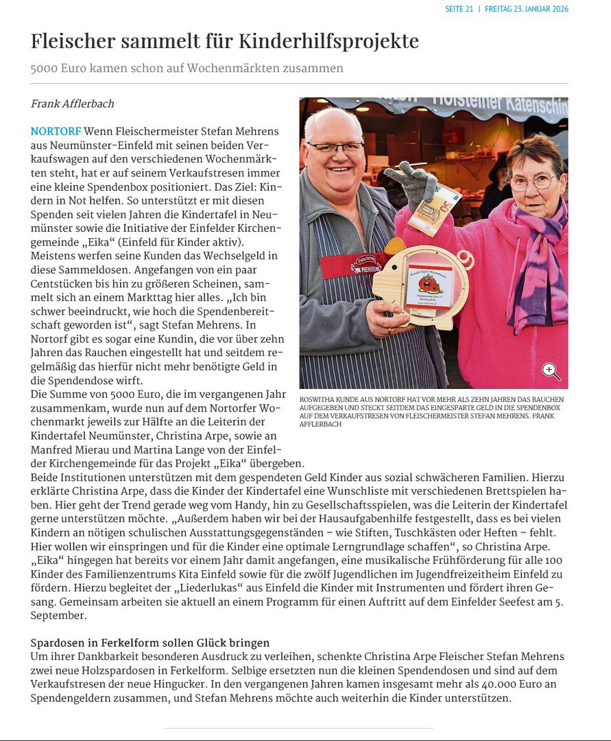 Fleischermeister Stefan Mehrens hat auch im Jahr 2025 an seinen Marktständen für soziale Projekte gesammelt